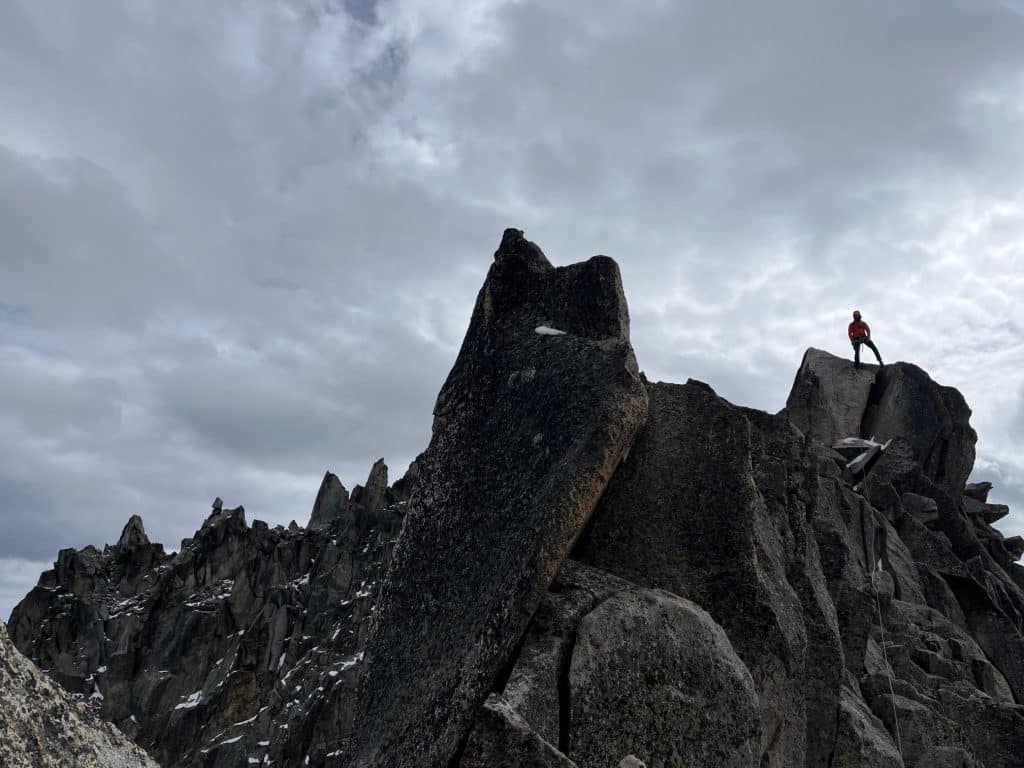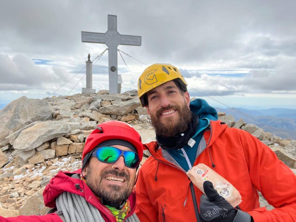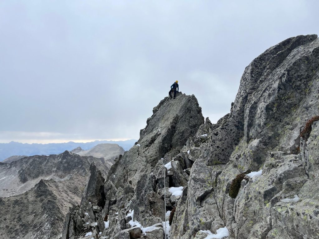 Vistas impresionantes y soitaria cima. Nos damos la enhorabuena por la actividad (de momento no finalizada), por haber solventado bien los nervios y por el horario. El Valiente decía que con las últimas complicaciones habíamos perdido mucho tiempo pero, para como estaba el patio (helado) al principio y que prácticamente la totalidad de la cresta la hicimos encordados en ensamble protegiendo con bastante criterio conviene decir que hicimos un horario muy bueno y que todas las maniobras de cuerda y de plegado que habíamos estado practicando habían sido eficientes así como a escalada segura, que otras veces o en otras crestas no se puede decir lo mismo (como nos decía Isaac, futuro pez gordo del Greim, se puede ir rápido y seguro).