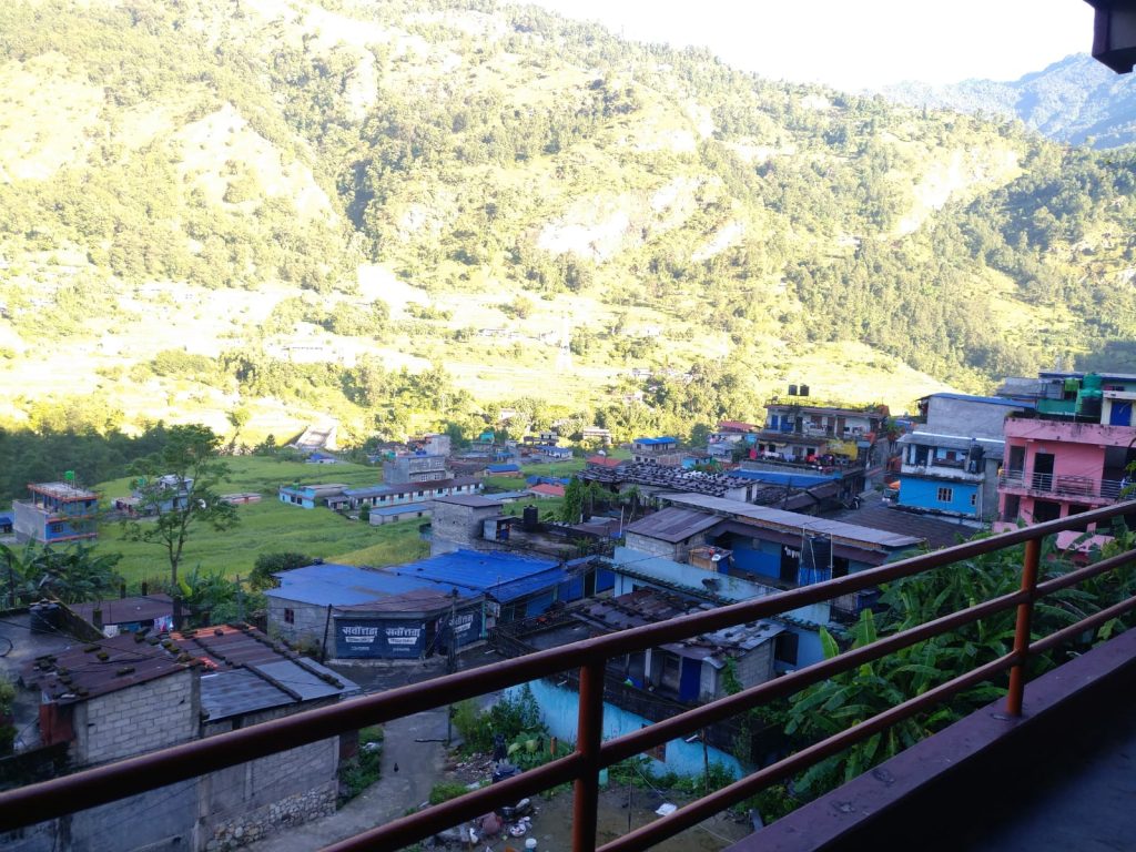 Llegamos enseguida a otro pueblito. Todavía quedan horas de luz y le propongo a Célia ir con la calma al siguiente, que según el mapa, es donde acaba la subida. Al día siguiente, apra empezar, habrá una bajada cruel y luego otra subida. Ese pueblo es Chomrong. Al llegar, preguntamos el precio a un alojamiento y como no nos convence, seguimos al siguiente. En este nos dicen que podemos dormir por 250 rupias (menos de 2€) cada uno en habitación con cama doble.