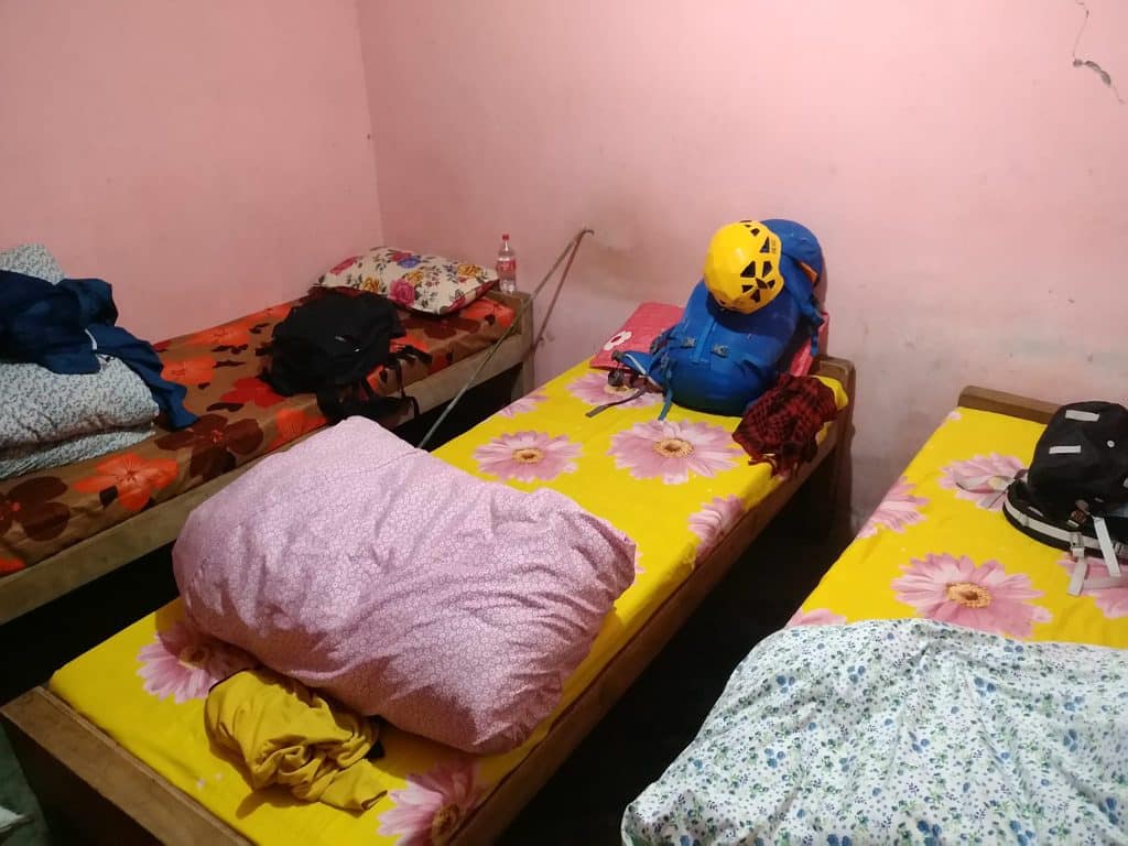 Descartada la idea de continuar, dedicamos unos minutos a buscar un lodge barato y comunicado. Nos decantamos por uno en medio del poblado que salía a algo menos de 500 rupias por cabeza (3€) . Además, por poco más de 1€ te podías conectar al WIFI para buscar información, mirar la meteo y entretenimiento de tarde. Aunque lo que mola de estos sitios en la montaña es juntarte en el dinning hall o salón a charlar con los guías, con los dueños y con cualquiera que quiera agarrar el capazo.