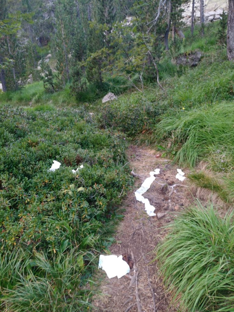 Al primer contacto con cobertura, aviso al Bou que ya había puesto sobre aviso a algún colega de que se intuía esmochamiento, jejeje, qué crack así que sólo toca acabar y llegar al coche en Estós, primero, y la furgo después. De camino vemos un mar de cagadas que por la mañana no estaban. Se debieron giñar vivos manchando ropa interior, pantalones, manos e incluso el alma….porque ni siquiera les dio para apartarse del camino. En otra vida o época, podríamos haber cogido una katana y hacer rodar un par de cabezas con un corte limpio. Por contra sería manchar más todavía el monte pero bueno, cuando San Pedro abra las puertas y juzgue, supongo que contará como atenuante el autocontrol, Sr.Juez.