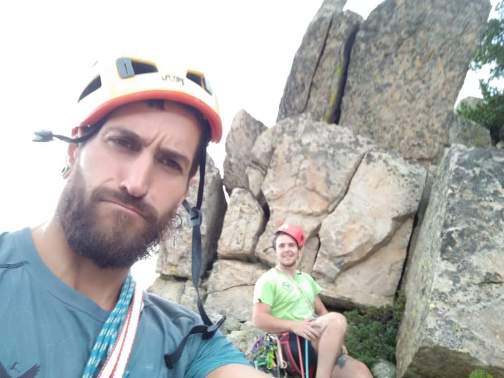 Como ya en una de las múltiples incursiones desde el rodeo hasta los pies de pared habíamos dejado cuerda y mochila, decidimos atacar en la otra dirección a la par que recuperarlas para no hacer toda la circular cual Domingueros con 20kg de sobrepeso. Retrocedemos unos 20-30mins hasta el pie de pared al que habíamos llegado una hora y media antes y vamos, ahora sí, hacia la derecha. Vemos una parejilla haciendo una vía. Les preguntamos y no tenían ni idea, pero ya intuimos que lejos no andaría porque me suena, además, haber visto en las reseñas de todas las agujas que había muchas vías cerca del comienzo de la Moskito Expanding.