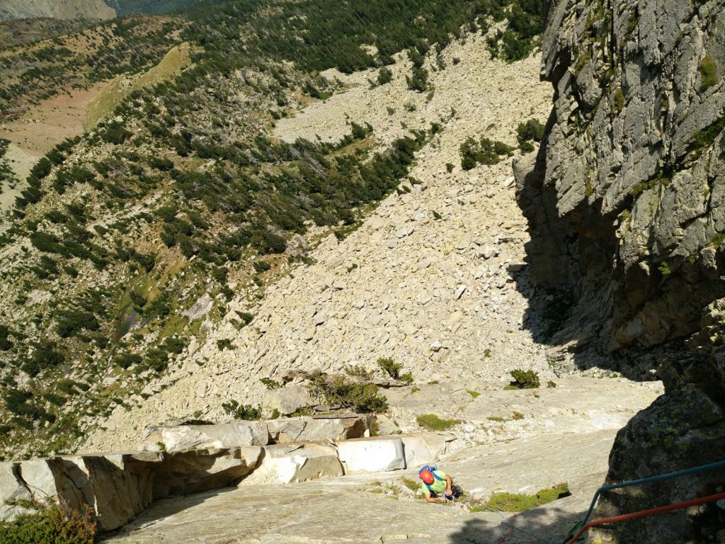El primer largo de la Patagonia se ve bastante bien por haber situado la fisura-techo del segundo largo (el de 7a). En la entrada se ve algún clavo al inicio y alguno por arriba. Empiezo yo porque quedamos en que Zorrillo tendía más oportunidad de gozarse la fisura. La verdad que, como leímos en alguna reseña, es bastante raro el largo. Y pretón. No sabes si ir por dentro, por fuera, a mitad o quien sabe qué, jajaja. Bastante raro y algo herboso. Lo libero porque no me queda de otra, con algún resoplido que nos indica que el grado está caro. Se protege medio bien aunque hay que pilotar los emplazamientos. Al final te montas en una repisa con múltiples opciones de montar reunión debajo de la fisura. Yo subo bastante arriba porque intuyo poder hacer un puente roca a reforzar con uno o dos fisureros y así dejar piezas libres al Zorrillo para la fisura. Zorrillo recupera mejor que yo el largo.